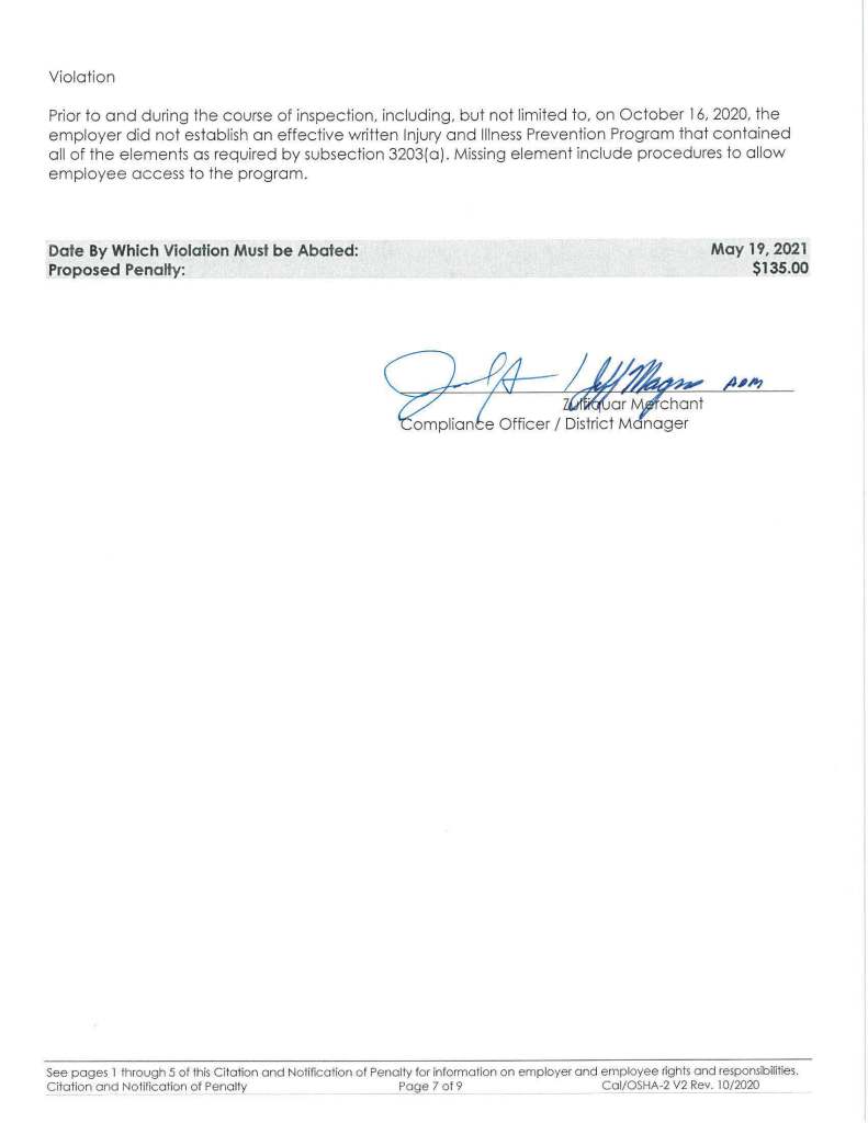 I have one client who recently had CAL/OSHA come onto their site due to a compliant about toilet facilities and access to water under the Heat Illness Prevention Program regulation. After walking the site and interviewing multiple employees, they could not find the employer at fault for the complaint items. BUT, after taking all of their allotted six months to issue a citation, CAL/OSHA decided to cite them for not having language in their IIPP that describes how they will give their employees access to it. It was a General Citation in the amount of $135. This could be the cheapest OSHA citation I have ever seen! Over something that had NOTHING to do with ANY of the alleged complaint items related to toilets or water. Even though no employee was denied a copy or access to my client’s IIPP (they would have gladly given a copy to any employee), CAL/OSHA cited them for merely not having this new language inserted into it. We are currently in the process of contesting this citation, but it is recommended that everyone doing business in California add this additional language to their IIPP to ensure it does not result in a future citation.